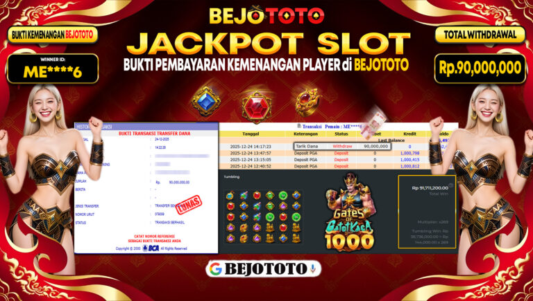 BEJOTOTO – Selamat kepada User id : ME****6 Telah berhasil mendapatkan kemenangan besar pada permainan SLOT PRAGMATIC PRAGMATIC GATES OF GATOT KACA 1000 Dengan kemenangan Sebesar Rp.90,000,000,-. Setelah mengisi formulir withdraw dengan kurung waktu hanya 5 – 10 menit pihak BEJOTOTO sudah melakukan transfer kepada pemilik Userid dan dana sudah dapat di cairkan oleh pemenang. Bukti pembayaran yang kami berikan merupakan bukti…
