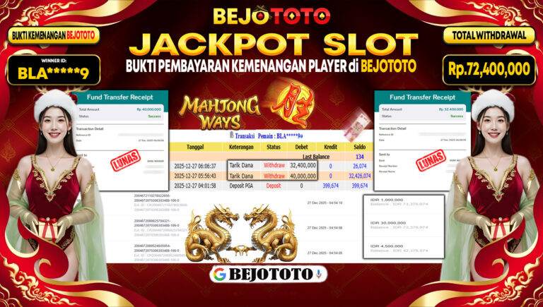 BEJOTOTO – Selamat kepada User id : BLA*****9 Telah berhasil mendapatkan kemenangan besar pada permainan SLOT MAHJONG WAYS Dengan kemenangan Sebesar Rp.72,400,000-. Setelah mengisi formulir withdraw dengan kurung waktu hanya 5 – 10 menit pihak BEJOTOTO sudah melakukan transfer kepada pemilik Userid dan dana sudah dapat di cairkan oleh pemenang. Bukti pembayaran yang kami berikan merupakan bukti pembayaran yang SAH…