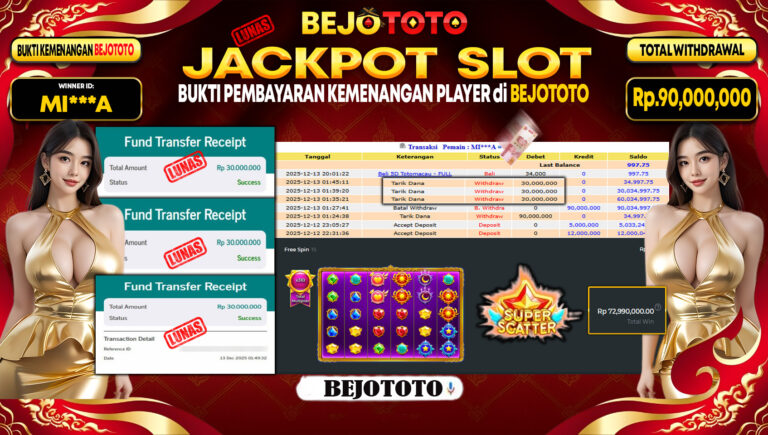 BEJOTOTO – Selamat kepada User id : MI***A Telah berhasil mendapatkan kemenangan besar pada permainan SLOT PRAGMATIC PRAGMATIC STARLIGHT PRINCESS SUPER SCATTER Dengan kemenangan Sebesar Rp.90,000,000,-. Setelah mengisi formulir withdraw dengan kurung waktu hanya 5 – 10 menit pihak BEJOTOTO sudah melakukan transfer kepada pemilik Userid dan dana sudah dapat di cairkan oleh pemenang. Bukti pembayaran yang kami berikan merupakan bukti…