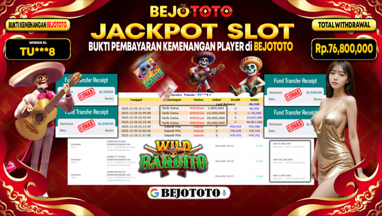 BEJOTOTO – Selamat kepada User id : TU***8 Telah berhasil mendapatkan kemenangan besar pada permainan SLOT WILD BANDITO Dengan kemenangan Sebesar Rp.76,800,000-. Setelah mengisi formulir withdraw dengan kurung waktu hanya 5 – 10 menit pihak BEJOTOTO sudah melakukan transfer kepada pemilik Userid dan dana sudah dapat di cairkan oleh pemenang. Bukti pembayaran yang kami berikan merupakan bukti pembayaran yang SAH…
