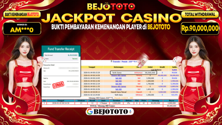 BEJOTOTO – Selamat kepada User id : am***0 Telah berhasil mendapatkan kemenangan besar pada permainan LIVE CASINO 48D GAMES Dengan kemenangan Sebesar Rp.90,000,000,-. Setelah mengisi formulir withdraw dengan kurung waktu hanya 5 – 10 menit pihak BEJOTOTO sudah melakukan transfer kepada pemilik Userid dan dana sudah dapat di cairkan oleh pemenang. Bukti pembayaran yang kami berikan merupakan bukti pembayaran yang SAH /…