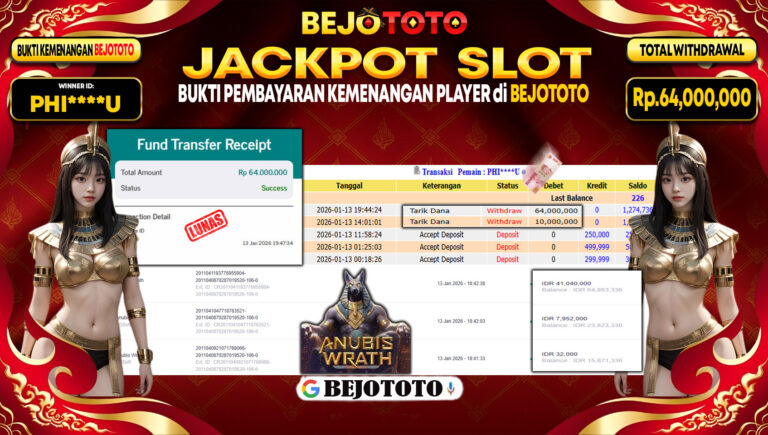 BEJOTOTO – Selamat kepada User id : PHI****U Telah berhasil mendapatkan kemenangan besar pada permainan SLOT ANUBIS WRATH Dengan kemenangan Sebesar Rp.64,000,000-. Setelah mengisi formulir withdraw dengan kurung waktu hanya 5 – 10 menit pihak BEJOTOTO sudah melakukan transfer kepada pemilik Userid dan dana sudah dapat di cairkan oleh pemenang. Bukti pembayaran yang kami berikan merupakan bukti pembayaran yang SAH…