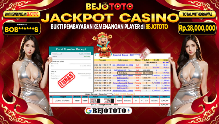 BEJOTOTO – Selamat kepada User id : BOB******S Telah berhasil mendapatkan kemenangan besar pada permainan LIVE CASINO BACCARAT 2 GAMES Dengan kemenangan Sebesar Rp.28,000,000,-. Setelah mengisi formulir withdraw dengan kurung waktu hanya 5 – 10 menit pihak BEJOTOTO sudah melakukan transfer kepada pemilik Userid dan dana sudah dapat di cairkan oleh pemenang. Bukti pembayaran yang kami berikan merupakan bukti pembayaran yang SAH…