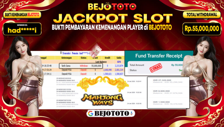 BEJOTOTO – Selamat kepada User id : had*****i Telah berhasil mendapatkan kemenangan besar pada permainan SLOT MAHJONG WAYS Dengan kemenangan Sebesar Rp.55,000,000-. Setelah mengisi formulir withdraw dengan kurung waktu hanya 5 – 10 menit pihak BEJOTOTO sudah melakukan transfer kepada pemilik Userid dan dana sudah dapat di cairkan oleh pemenang. Bukti pembayaran yang kami berikan merupakan bukti pembayaran yang SAH…