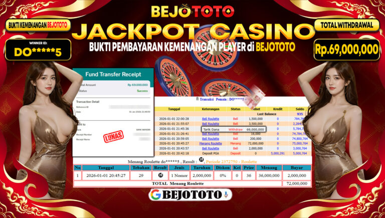 BEJOTOTO – Selamat kepada User id : DO*****5 Telah berhasil mendapatkan kemenangan besar pada permainan LIVE CASINO ROULETTE GAMES Dengan kemenangan Sebesar Rp.69,000,000,-. Setelah mengisi formulir withdraw dengan kurung waktu hanya 5 – 10 menit pihak BEJOTOTO sudah melakukan transfer kepada pemilik Userid dan dana sudah dapat di cairkan oleh pemenang. Bukti pembayaran yang kami berikan merupakan bukti pembayaran yang SAH /…