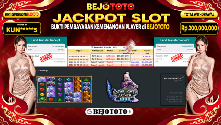 BEJOTOTO – Selamat kepada User id : KUN*****5 Telah berhasil mendapatkan kemenangan besar pada permainan SLOT PRAGMATIC PRAGMATIC STARLIGHT ARCHER 1000 Dengan kemenangan Sebesar Rp.200,000,000,-. Setelah mengisi formulir withdraw dengan kurung waktu hanya 5 – 10 menit pihak BEJOTOTO sudah melakukan transfer kepada pemilik Userid dan dana sudah dapat di cairkan oleh pemenang. Bukti pembayaran yang kami berikan merupakan bukti pembayaran yang SAH…