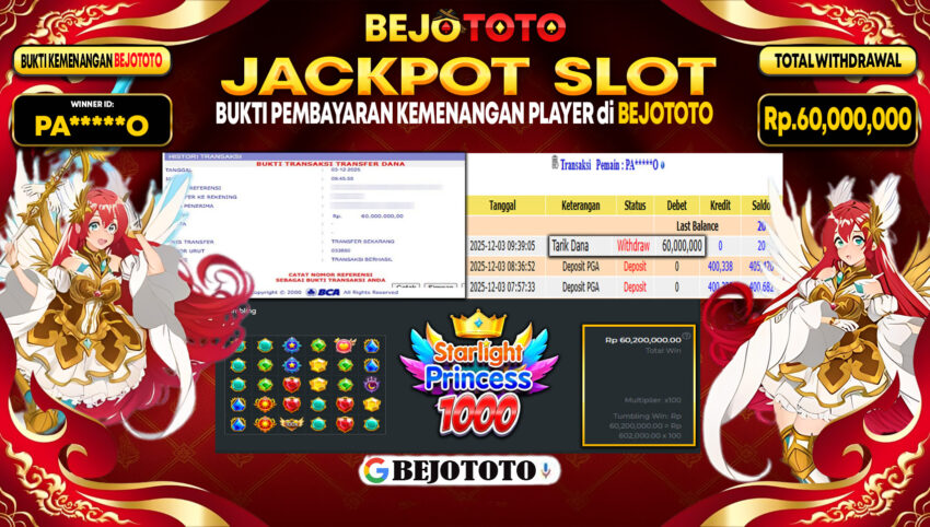 BEJOTOTO – Selamat kepada User id : PA*****O Telah berhasil mendapatkan kemenangan besar pada permainan SLOT PRAGMATIC PRAGMATIC STARLIGHT PRINCESS 1000 Dengan kemenangan Sebesar Rp.60,000,000,-. Setelah mengisi formulir withdraw dengan kurung waktu hanya 5 – 10 menit pihak BEJOTOTO sudah melakukan transfer kepada pemilik Userid dan dana sudah dapat di cairkan oleh pemenang. Bukti pembayaran yang kami berikan merupakan bukti pembayaran yang SAH / VALID yang langung di dapatkan melaui tanda transfer transaksi dari Bank yang di tuju.