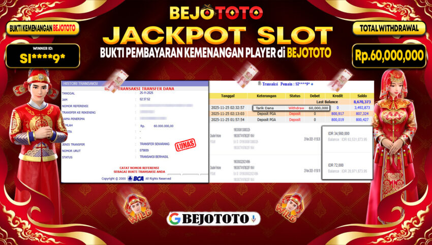 BEJOTOTO – Selamat kepada User id : SI****9* Telah berhasil mendapatkan kemenangan besar pada permainan SLOT DOUBLE FORTUNE Dengan kemenangan Sebesar Rp.60,000,000-. Setelah mengisi formulir withdraw dengan kurung waktu hanya 5 – 10 menit pihak BEJOTOTO sudah melakukan transfer kepada pemilik Userid dan dana sudah dapat di cairkan oleh pemenang. Bukti pembayaran yang kami berikan merupakan bukti pembayaran yang SAH / VALID yang langung di dapatkan melaui tanda transfer transaksi dari Bank yang di tuju.