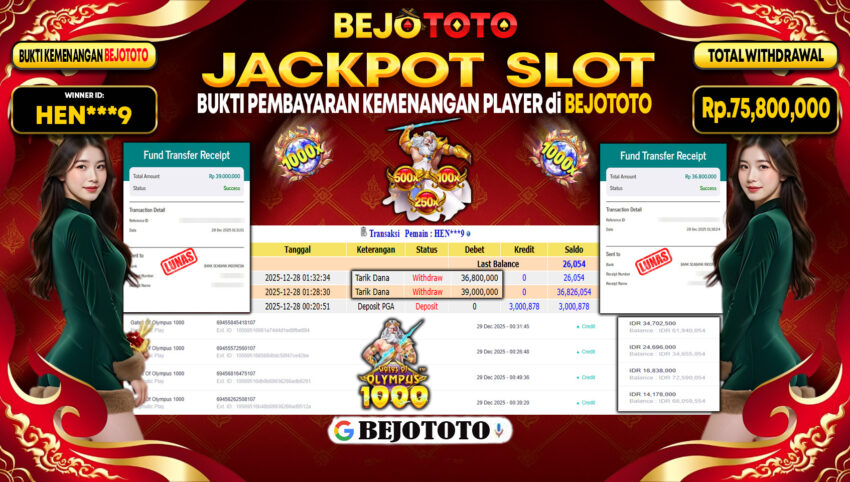 BEJOTOTO – Selamat kepada User id : HEN***9 Telah berhasil mendapatkan kemenangan besar pada permainan  SLOT PRAGMATIC GATES OF OLYMPUS 1000  Dengan kemenangan Sebesar Rp.75,800,000,-. Setelah mengisi formulir withdraw dengan kurung waktu hanya 5 – 10 menit pihak BEJOTOTO sudah melakukan transfer kepada pemilik Userid dan dana sudah dapat di cairkan oleh pemenang. Bukti pembayaran yang kami berikan merupakan bukti pembayaran yang SAH / VALID yang langung di dapatkan melaui tanda transfer transaksi dari Bank yang di tuju.