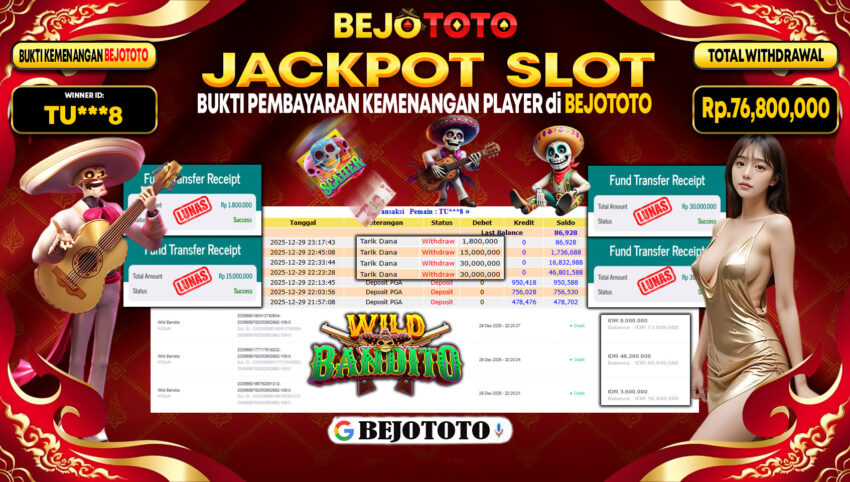 BEJOTOTO – Selamat kepada User id : TU***8 Telah berhasil mendapatkan kemenangan besar pada permainan SLOT WILD BANDITO Dengan kemenangan Sebesar Rp.76,800,000-. Setelah mengisi formulir withdraw dengan kurung waktu hanya 5 – 10 menit pihak BEJOTOTO sudah melakukan transfer kepada pemilik Userid dan dana sudah dapat di cairkan oleh pemenang. Bukti pembayaran yang kami berikan merupakan bukti pembayaran yang SAH / VALID yang langung di dapatkan melaui tanda transfer transaksi dari Bank yang di tuju.