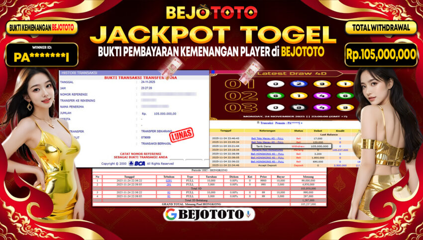 BEJOTOTO – Selamat kepada User id : PA*******I Telah berhasil mendapatkan kemenangan besar pada permainan TOGEL HONGKONG LOTTO Dengan kemenangan Sebesar Rp.105,000,000,-. Setelah mengisi formulir withdraw dengan kurung waktu hanya 5 – 10 menit pihak BEJOTOTO sudah melakukan transfer kepada pemilik Userid dan dana sudah dapat di cairkan oleh pemenang. Bukti pembayaran yang kami berikan merupakan bukti pembayaran yang SAH / VALID yang langung di dapatkan melaui tanda transfer transaksi dari Bank yang di tuju.