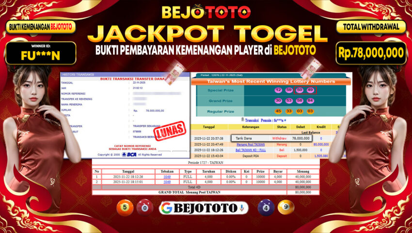 BEJOTOTO – Selamat kepada User id : FU***N Telah berhasil mendapatkan kemenangan besar pada permainan TOGEL TAIWAN Dengan kemenangan Sebesar Rp.78,000,000,-. Setelah mengisi formulir withdraw dengan kurung waktu hanya 5 – 10 menit pihak BEJOTOTO sudah melakukan transfer kepada pemilik Userid dan dana sudah dapat di cairkan oleh pemenang. Bukti pembayaran yang kami berikan merupakan bukti pembayaran yang SAH / VALID yang langung di dapatkan melaui tanda transfer transaksi dari Bank yang di tuju.