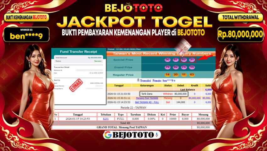 BEJOTOTO – Selamat kepada User id : ben****9 Telah berhasil mendapatkan kemenangan besar pada permainan TOGEL TAIWAN Dengan kemenangan Sebesar Rp.80,000,000,-. Setelah mengisi formulir withdraw dengan kurung waktu hanya 5 – 10 menit pihak BEJOTOTO sudah melakukan transfer kepada pemilik Userid dan dana sudah dapat di cairkan oleh pemenang. Bukti pembayaran yang kami berikan merupakan bukti pembayaran yang SAH / VALID yang langung di dapatkan melaui tanda transfer transaksi dari Bank yang di tuju.